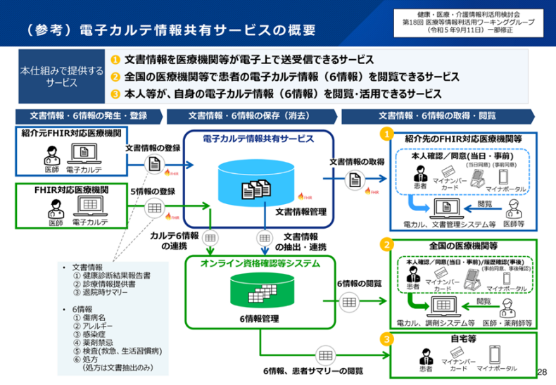 なお、電子カルテ情報共有サービスは、厚労省が推進している医療DXの推進活動の中核となるもので、おおよその機能は下図のようになる。