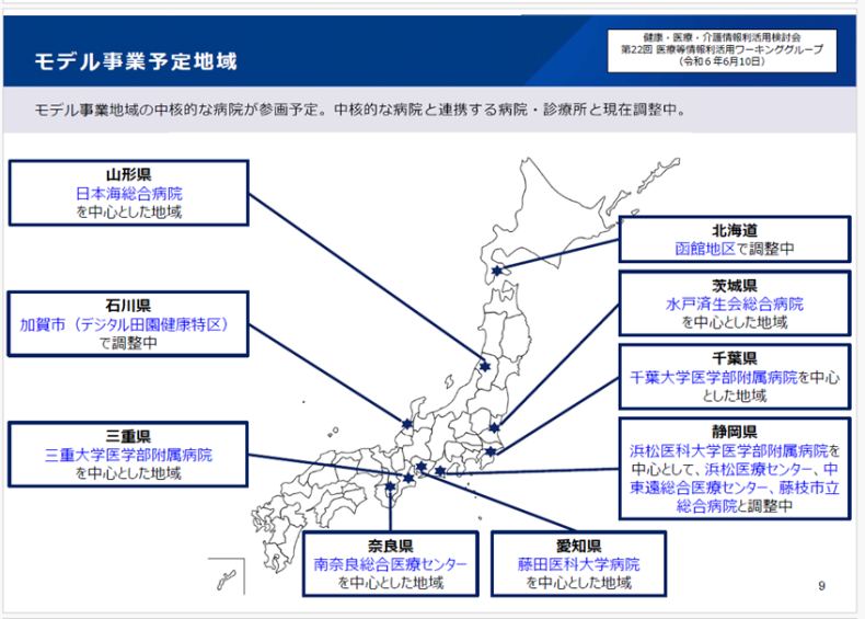 日本全国で見れば、これらの活動の前提となる電子カルテの導入も十分ではないが、これらの推進は、まずは上図のように、3文書6情報を電子カルテ情報共有サービス、オンライン資格確認等システムへの登録し、活用することを。下図のようなモデル事業で令和7年度中に本番の運用での稼働を目指し進めつつあり、藤田医科大学はこのモデル事業にまず最初に手を挙げて参加している。具体的な進捗の状況は、この投稿最後の参考資料の4.と5.に説明されている。